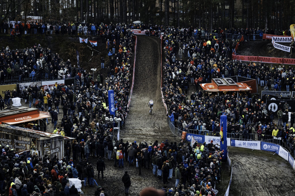 Der Parcours im belgischen Zonhoven zieht in weiten Schleifen durch und um die riesige Sandgrube „De Kuil“. Die Kulisse erinnert an ein modernes Amphitheater. Tausende Fans säumen die Strecke, wenn die Fahrer:innen mehrmals pro Runde in die Grube stürzen und später – oft laufend, manchmal fahrend – wieder herausklettern. Cycling Flanders bewirbt das Rennen in Zonhoven nicht ohne Grund mit „deep sand, steep climbs and descents“ und einem „day of fun in the sandbox“.