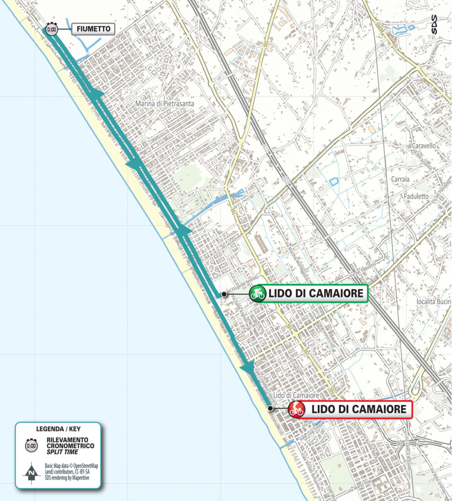 Wie schon in den Vorjahren eröffnet ein vollkommen flaches Einzelzeitfahren in Lido di Camaiore Tirreno Adriatico. Der 11,5 Kilometer lange Kapf gegen di Uhr besteht aus zwei fast vollständig identisch geraden Hin- und Rückstrecken entlang der Küste von Camaiore und Viareggio, mit nur wenigen Kurven und einem Wendepunkt. Diese Kehrtwende bei Kilometer 5,0 in Fiumetto markiert die Zwischenzeitmessung. Die Rückfahrt führt direkt zurück nach Lido di Camaiore, wo eine leichte S-Kurve in den letzten Kilometer mündet.