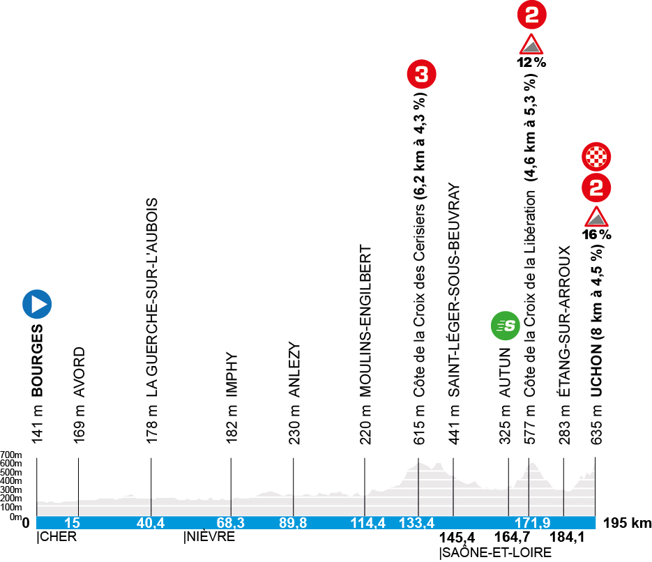 The team time trial is followed by the first mountain finish of this tour – up to Uchon. After the start in Bourges, the first 120 kilometers are flat. Only then does the terrain become challenging: The start is made by the Côte de la Croix des Cerisiers. A 3rd category climb with a length of 6.2 kilometers and an average gradient of 4.3 percent. Once this climb has been completed, the final begins around 30 kilometers later with the Côte de la Croix de la Libération – 4.6 kilometers with a 5.3 percent gradient. However, there are sections with gradients of up to 12 percent.