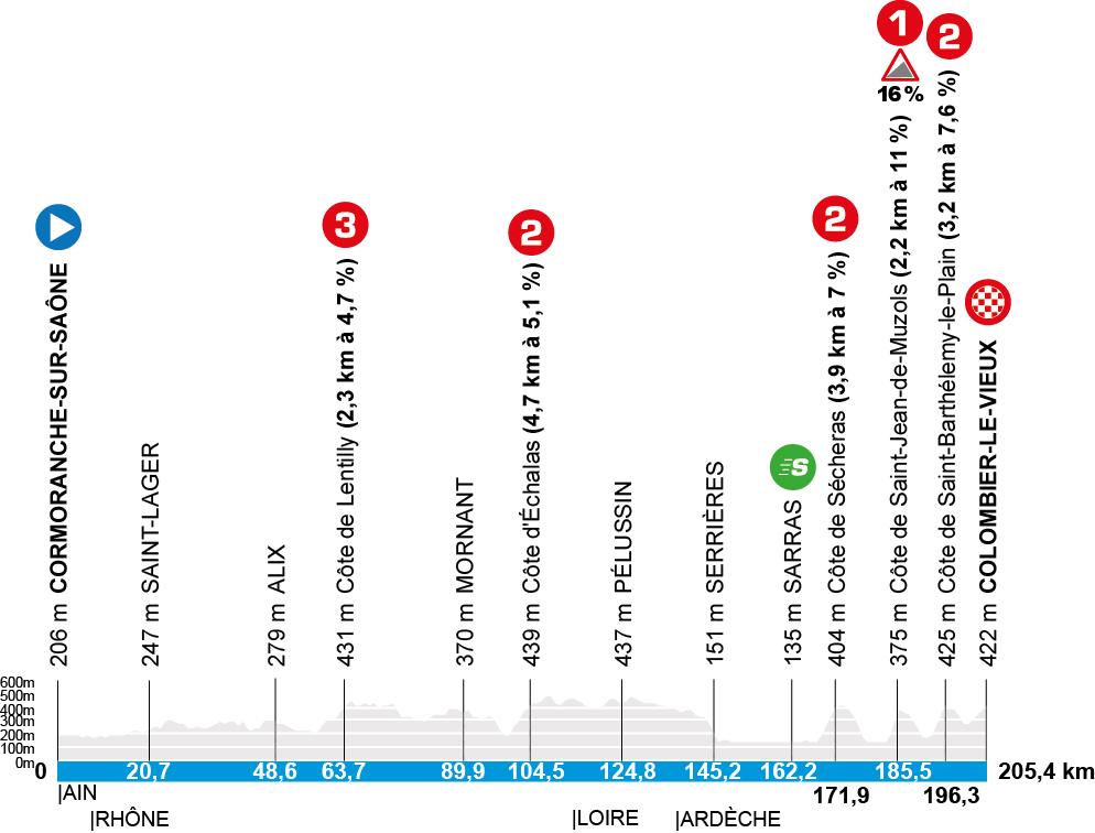 The start to the “Côte-Hopping” is made after a good 60 kilometers with the Côte de Lentilly (2.3 kilometers with a 4.7 percent gradient). 40 kilometers later follows the Côte d’Échalas (4.7 kilometers with a 5.1 percent gradient). Then there is a short “rest” before the final storm. In the last 40 kilometers there are three categorized climbs and a mountain finish to Colombier-le-Vieux. The start to an elimination race is made by the Côte de Sécheras (3.9 kilometers with 7 percent). At a distance of 10 to 12 kilometers each, the Côte de Saint-Barthélemy-le-Plain (3.2 kilometers with 7.6 percent, maximum 16 percent) and the Côte de Saint-Jean-de-Muzols (2.2 kilometers with 11 percent) follow. After a short descent, the approach to the finish begins.