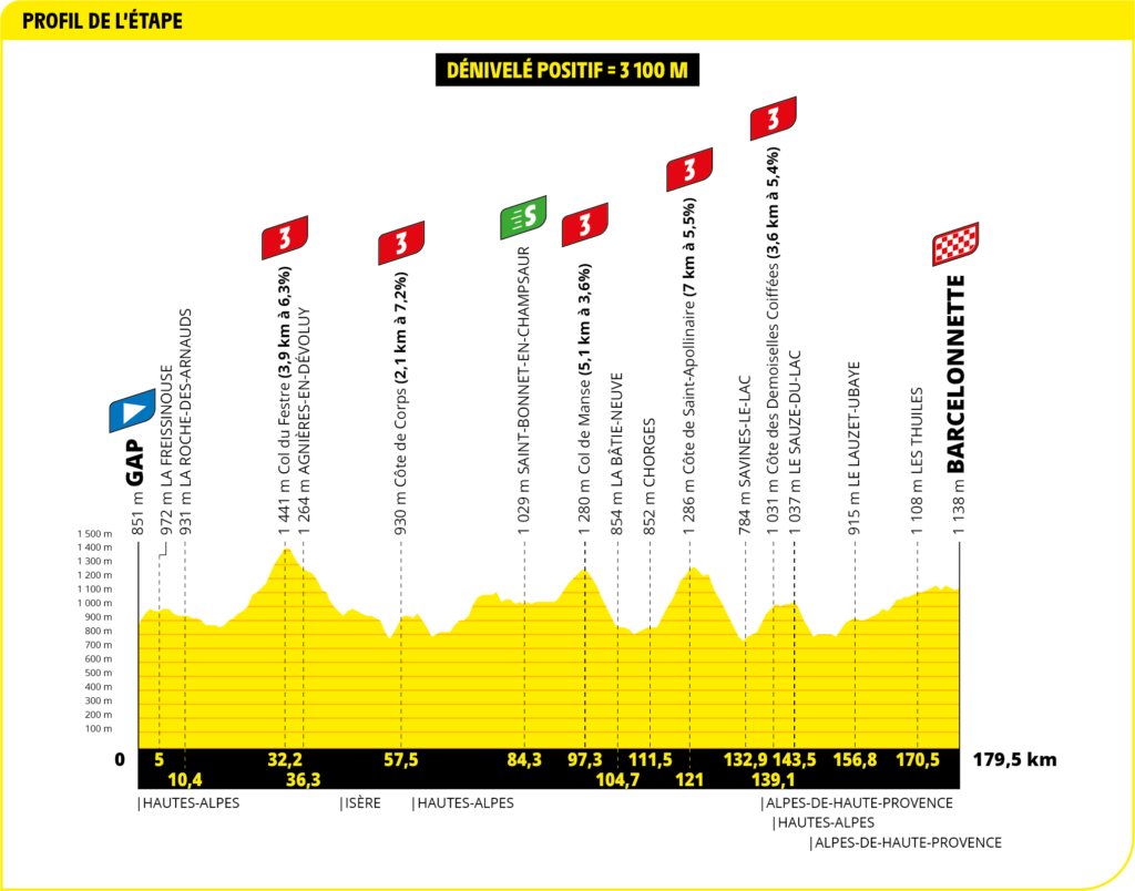 The riders will then face Col de Manse (5.1 kilometers at 3.6 percent), Côte à Saint-Apollinaire (7 kilometers at 5.5 percent), and Côte de Demoiselles Coiffées (3.6 kilometers at 5.4 percent) at roughly 20-kilometer intervals. After descending, they will climb again for 25 kilometers through Le Lauzet-Ubaye and Les Thuiles before the final five relatively flat kilometers to the finish.