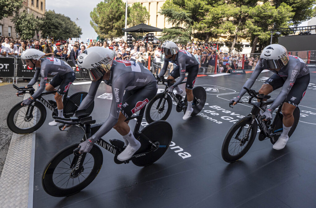 Dann rollte Ineos Grenadiers von der Rampe, angetrieben vom zweifachen Weltmeister Filippo Ganna. Die Equipe um GC-Kapitän Egan Bernal startete furios und lagen am ersten Kontrollpunkt (km 7,8) fast zehn Sekunden vor Lidl-Trek. Doch das Pacing der britischen Mannschaft erwies sich über die gesamte Distanz als schwer zu halten, am Ende reichte es für Ineos nicht ganz für die Führung. Red Bull–Bora-Hansgrohe drängte sich trotz eines Sturzes von Matteo Sobrero zwischen LIdl-TTrek und Ineos Grenadier – mit nur drei Sekunden auf das Team von Mads Pedersen.