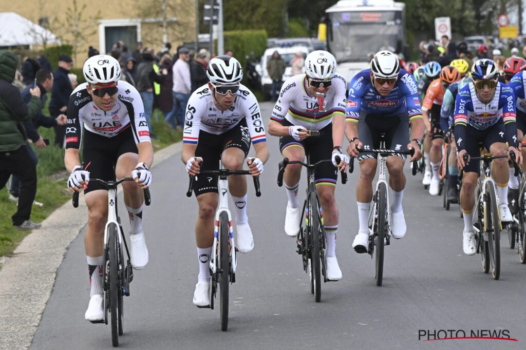 Bereits rund 100 Kilometer vor dem Ziel am Molenberg bildete sich eine 17 Fahrer starke Verfolgergruppe mit allen Favoriten. Diese setzte sich schnell vom Peloton ab und holten die Ausreißer schnell ein. Bei der zweiten Überfahrt des Oude Kwaremont „filetierte” Pogi dann diese Spitzengruppe. Nur van der Poel und Evenepoel konnten mithalten. Am folgenden Anstieg, dem Paterberg musste Evenepoel dann reißen lassen. Pogacar und van der Poel machten bis zur finalen Überfahrt des Kwaremont gemeinsame Sache. Dort eskalierte Pogacar erneut und fuhr als Solist dem Ziel entgegen.