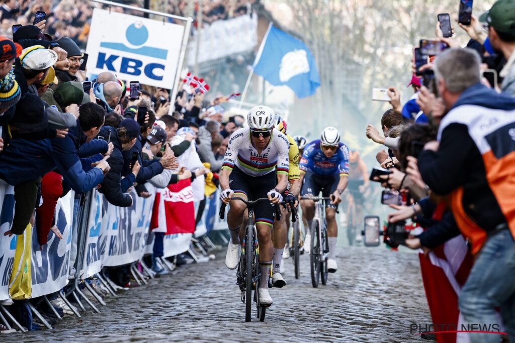 Am Oude Kwaremont beschleunigte Pogačar bereits am ersten steilen Abschnitt und konnte eine Lücke zu van der Poel reißen. Oben an der Kuppe hatte der Weltmeister sechs Sekunden Vorsprung. Evenepoel hatte hier jetzt einen Rückstand von 49 Sekunden.