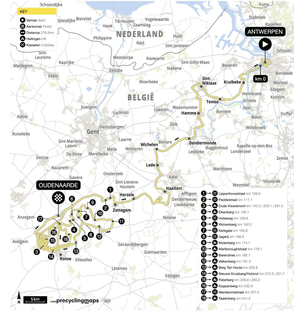 Mit dem Wechsel des Startorts von Brügge zurück nach Antwerpen verändert sich vor allem die lange Anfahrt in die flämischen Ardennen. Nach Teampräsentation auf der Grote Markt fällt der Startschuss um 10 Uhr an der Ernest Van Dijckkaai. Erst nach mehr als 100 Kilometern werden die Straßen richtig rau: Die ersten Pflasterpassagen warten auf Lippenhovestraat und Paddestraat, ehe der Oude Kwaremont fast exakt zur Rennhalbzeit erstmals überquert wird.