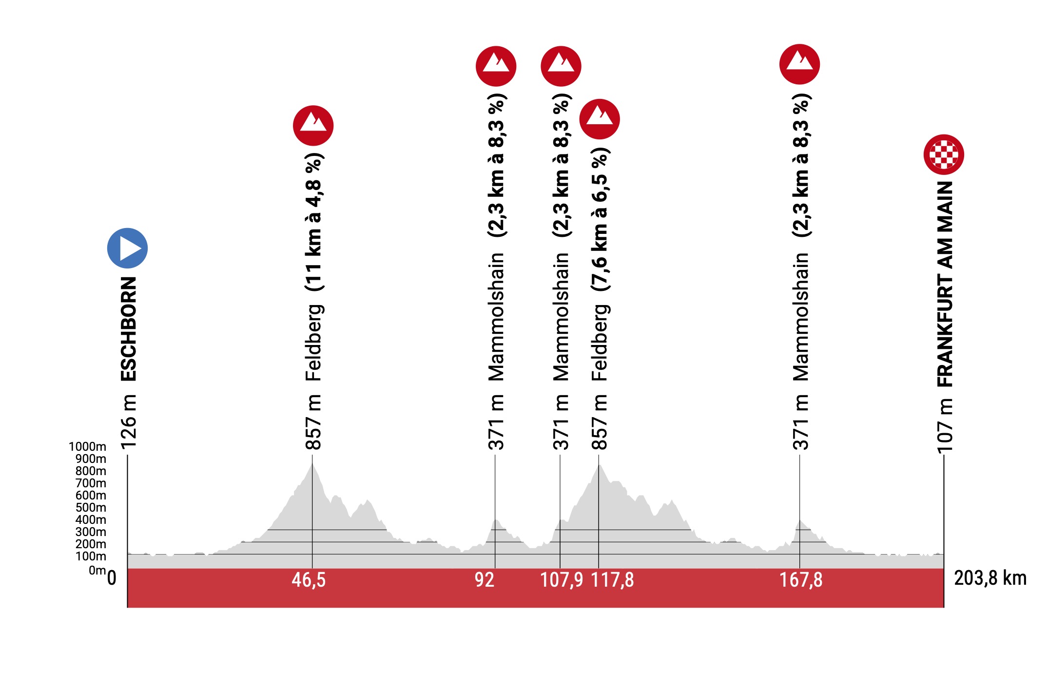 Zwei Mal müssen die Profis daher über den 857 Meter hohen Feldberg – von zwei unterschiedlichen Seiten; sowie drei Mal den Mammolshainer hoch. Doch der Reihe nach. Nach dem Start in Eschborn und der ersten Zieldurchfahrt in Frankfurt erreichen die Profis bereits in der ersten Rennstunde den Anstieg zum Feldberg. Über 11 Kilometer führt der Anstieg mit 4,8 Prozent durchschnittliche Steigung zum höchsten Berg im Taunus. Über Eppstein gelangen die Profis dann zum ersten Mal zum Mammolshainer (Rennkilometer 92). Die berühmte „Rampe“ ist 2,3 Kilometer lang und weist durchschnittlich eine Steigung von 8,3 Prozent aus – die Spitzen liegen allerdings im zweistellige Bereich.