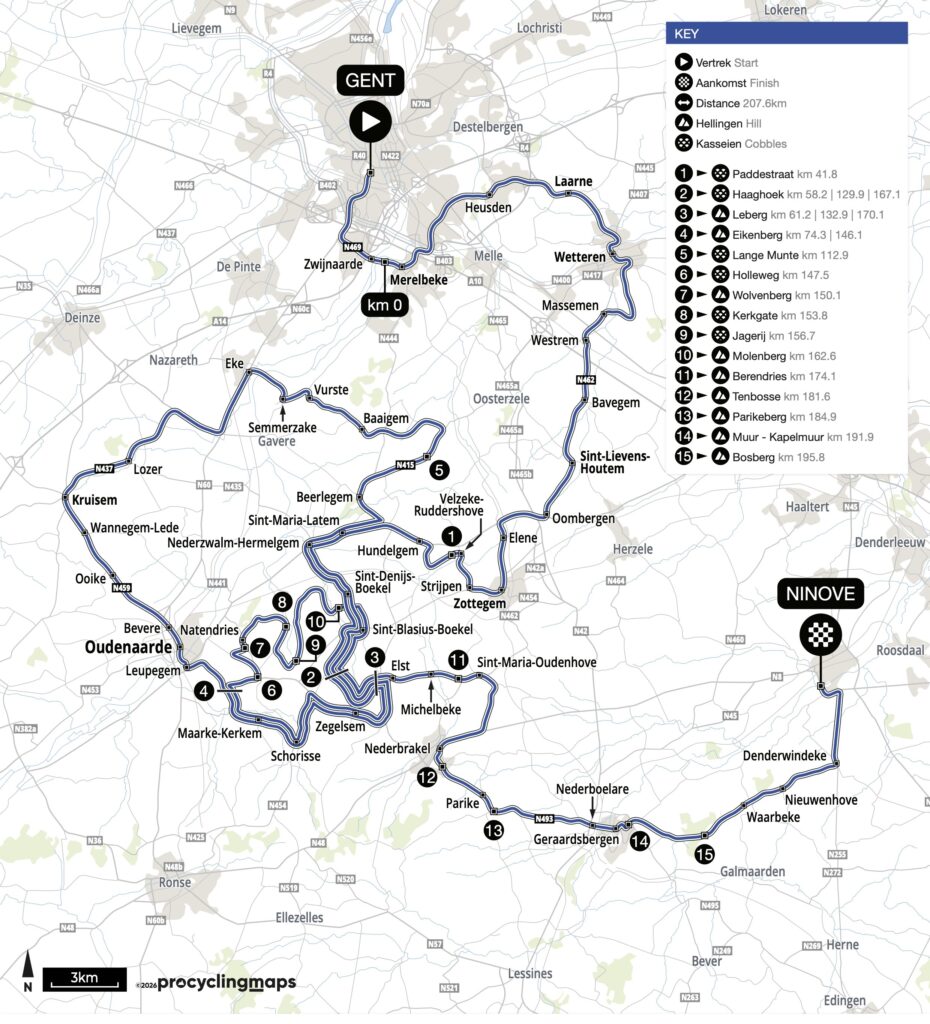 Nach dem neutralisierten Start in Gent müssen die Fahrer insgesamt acht Kopfsteinpflasterabschnitte und zwölf Anstiege bewältigen. Die ersten Kilometer führen vom Stadion aus über vergleichsweise breite Straßen. Nach rund 40 Kilometern folgt mit der Padestraat der erste Kopfsteinpflasterabschnitt. Über Haaghoek und den Lebberg gelangen die Fahrer ins Epizentrum des Rennens und nehmen die große Schleife um Oudenaarde in Angriff, die Leberg und den Eikenberg sowie den Pave-Abschnitt Lange Munte umfasst. Über Haaghoek und Lebberg gelangen die Fahrer ins Epizentrum des Rennens und auf eine kürzere Schleife mit Kerkgate und Jagerij. Danach folgt mit dem Molenberg der erste echte „Schafrichter“. Von dort aus führt die Strecke über die dritte Passage Haaghoek-Leberg weiter Richtung Berendries.