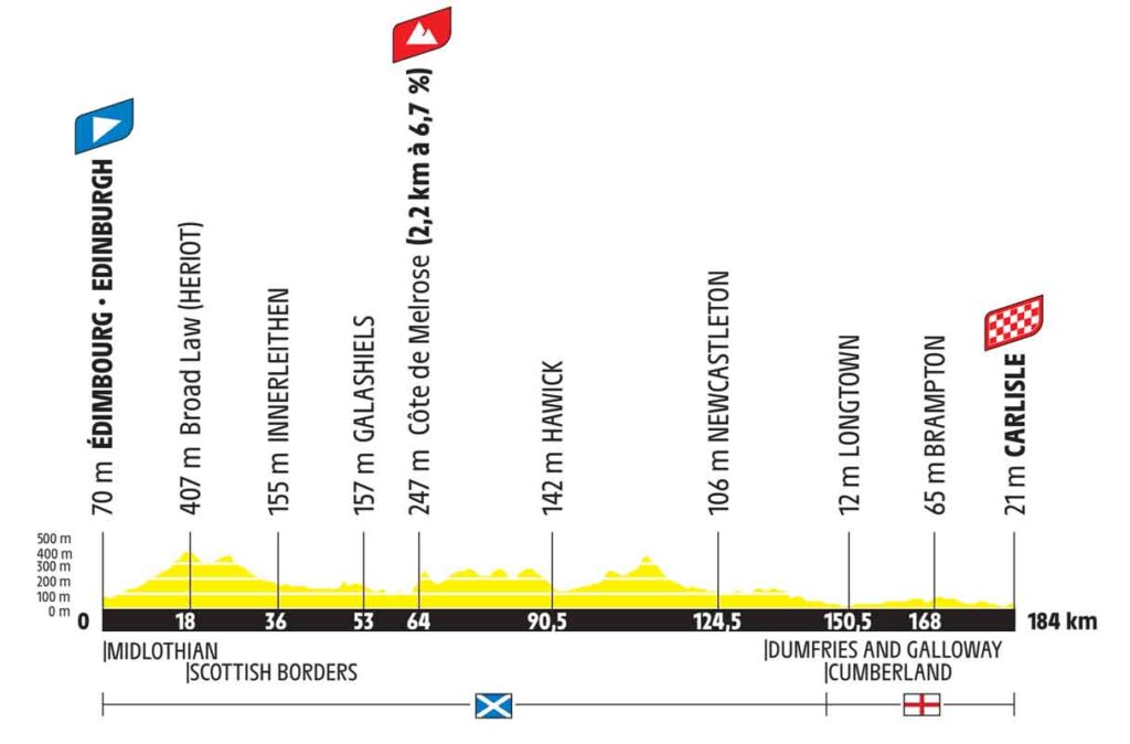 Die erste Etappe der Tour de France 2027 beginnt in der schottischen Hauptstadt Edinburgh und führt über 184 Kilometer nach Carlisle. Die ersten beiden Drittel der Etappe sind hügelig. Nach 64 Kilometern erreichen die Profis die erste Bergwertung dieser 114. Frankreich-Rundfahrt. Die Côte de Melrose ist 2,2 Kilometer lang und steigt durchschnittlich mit 6,7 Prozent an. Nach rund 125 Kilometern wird es wesentlich flacher und die finalen 60 Kilometer dürften die Sprinter topographisch vor keine großen Probleme stellen. Wenn alles gut läuft, wird man im englischen Zielort Carlisle einen Sprint Royal sehen und ein Sprinter dürfte das erste Gelbe Trikot der Tour de France 2027 tragen.