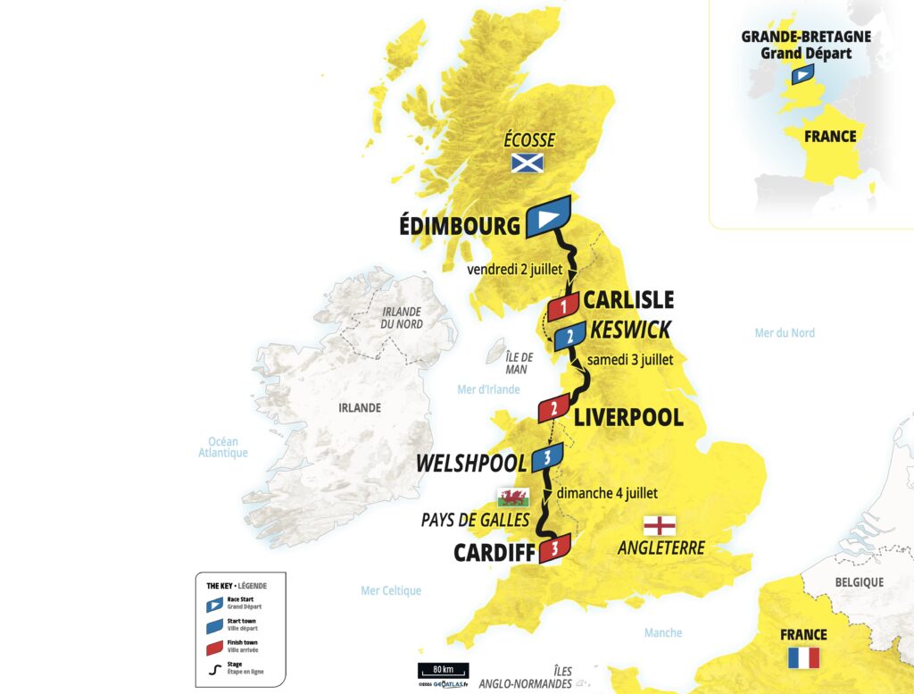 Die Tour de France startet im Jahr 2027 in Schottland. Am Freitag, dem 2. Juli, führt die erste Etappe von Edinburgh nach Carlisle in England. Im Rahmen des Grand Départs in Großbritannien finden am ersten Juli-Wochenende drei Etappen durch Schottland, England und Wales statt. Danach wird es voraussichtlich einen Transfertag geben, ehe die Tour am 6. Juli in Frankreich weitergeht.