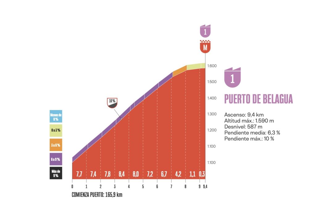 Das Finale der 10. Etappe findet am 9,4 Kilometer langen Anstieg zum Puerto de Belagua in den Pyrenäen statt. Der Anstieg der 1. Kategorie ist durchschnittlich 6,3 Prozent steil, was aber nichts über seine Charakteristik aussagt. Bis rund drei Kilometer vor dem Ziel steigt die Straße nämlich zwischen sieben und 8,5 Prozent an, darunter befinden sich auch Rampen von bis zu zehn Prozent. Erst die letzten drei Kilometer verlaufen deutlich flacher.