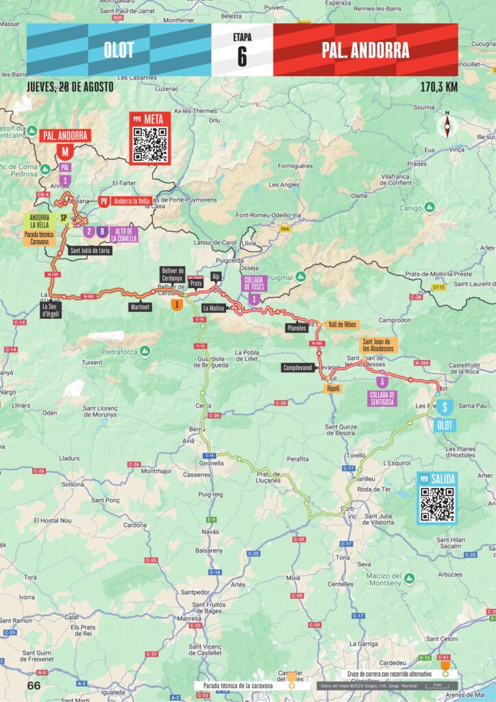 Nach einer längeren, leicht abfallenden Passage durch das Segre-Tal steigt die Straße bei Rennkilometer 125 wieder leicht an. Hinter La Seu d’Urgell erreichen die Profis die Grenze nach Andorra. Im Fürstentum Andorra wird in Andorra la Vella ein Zwischensprint ausgetragen, ehe nur 700 Meter dahinter der Aufstieg zum Alto de la Comella beginnt.