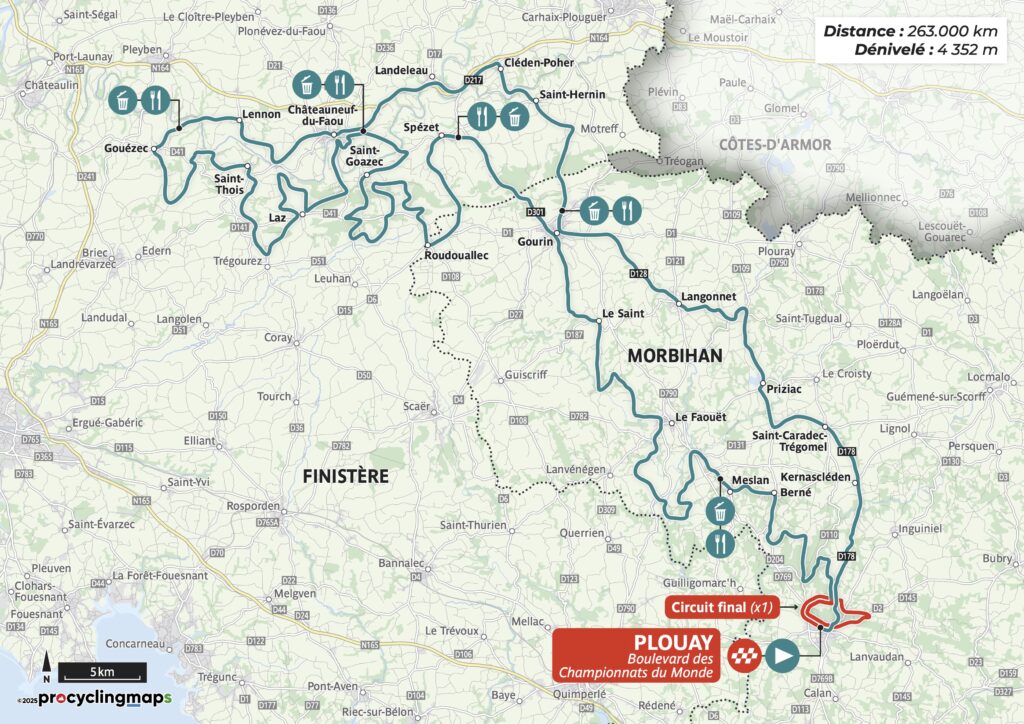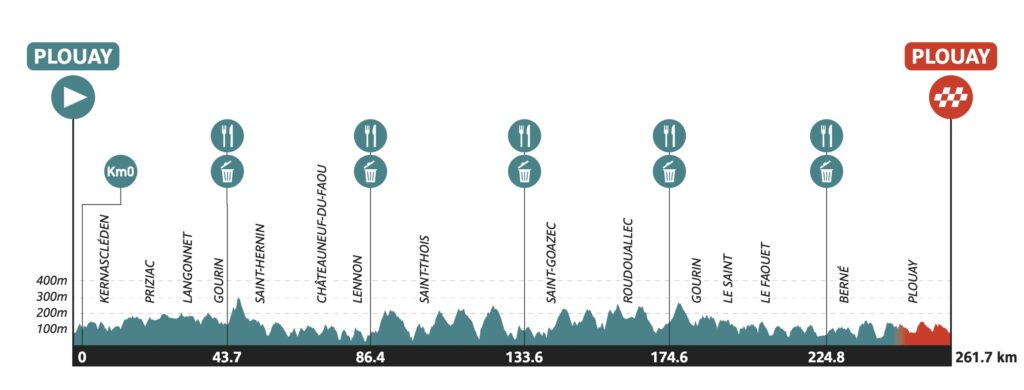 Nach der knapp 250 Kilometer langen Schleife kehrt das Rennen nach Plouay zurück. Dort biegen sie auf einen Rundkurs ein. Hier gibt es mit der Côte du Lezot mit 5,3 Prozent noch einen harten Anstieg. .