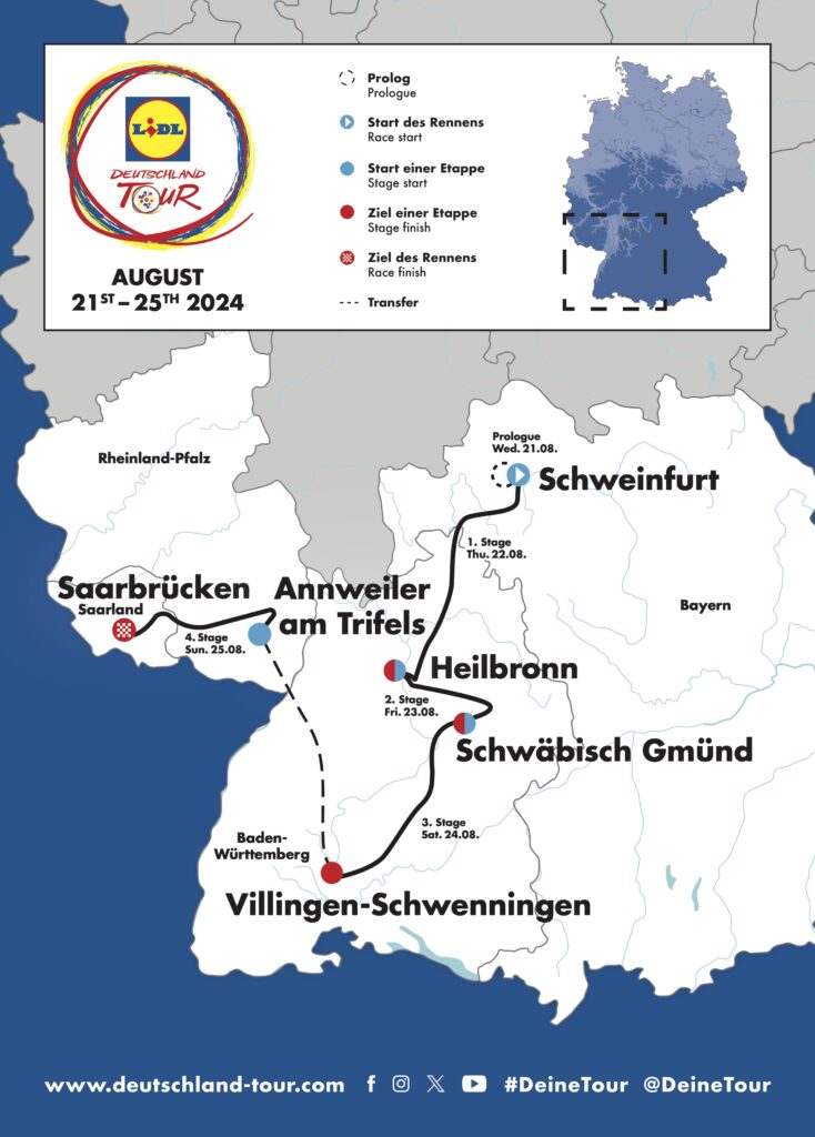 Die Deutschland Tour mit dem neuem Hauptsponsor Lidl führt vom 21. bis 25. August 2024 über 737 Kilometer durch vier Bundesländer. Start ist im bayerischen Schweinfurt mit einem Prolog. Danach folgen vier Etappen, die das Peloton durch den Süden Deutschlands führen. Zu Ende geht die fünftägige Rundfahrt der ProSeries am 25. August in Saarbrücken.