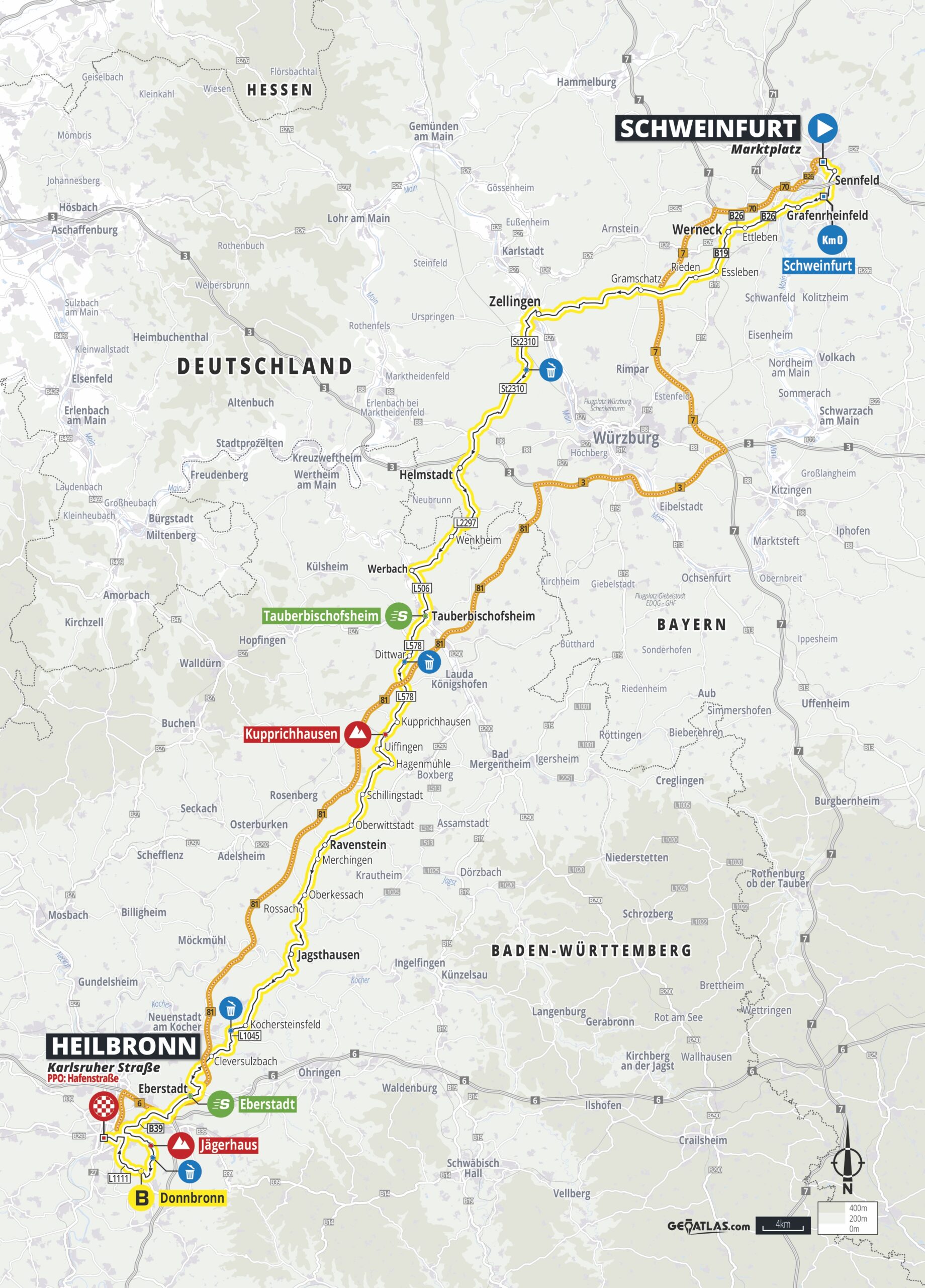 Wie am Vortag ist der Schweinfurter Markt Startort der Etappe. Das Ziel liegt allerdings an Tag zwei schon etwas weiter weg – im Norden Baden-Württembergs. Nach einer neutralisierten Passage über die Maxbrücke und den Main beginnt der scharfe Start am Stadtrand der unterfränkischen Stadt. Über 176,3 Kilometer verläuft der wellige Abschnitt über Tauberbischofsheim, der Bergwertung in Kupprichhausen und Jagsthausen ins Etappenziel nach Heilbronn. Dort müssen die Profis rund 15 Kilometer vor Ziel hoch zum Jägerhaus – ein Anstieg mit zweistelligen Prozenten und ideal für eine Attacke im Finale des Rennens.