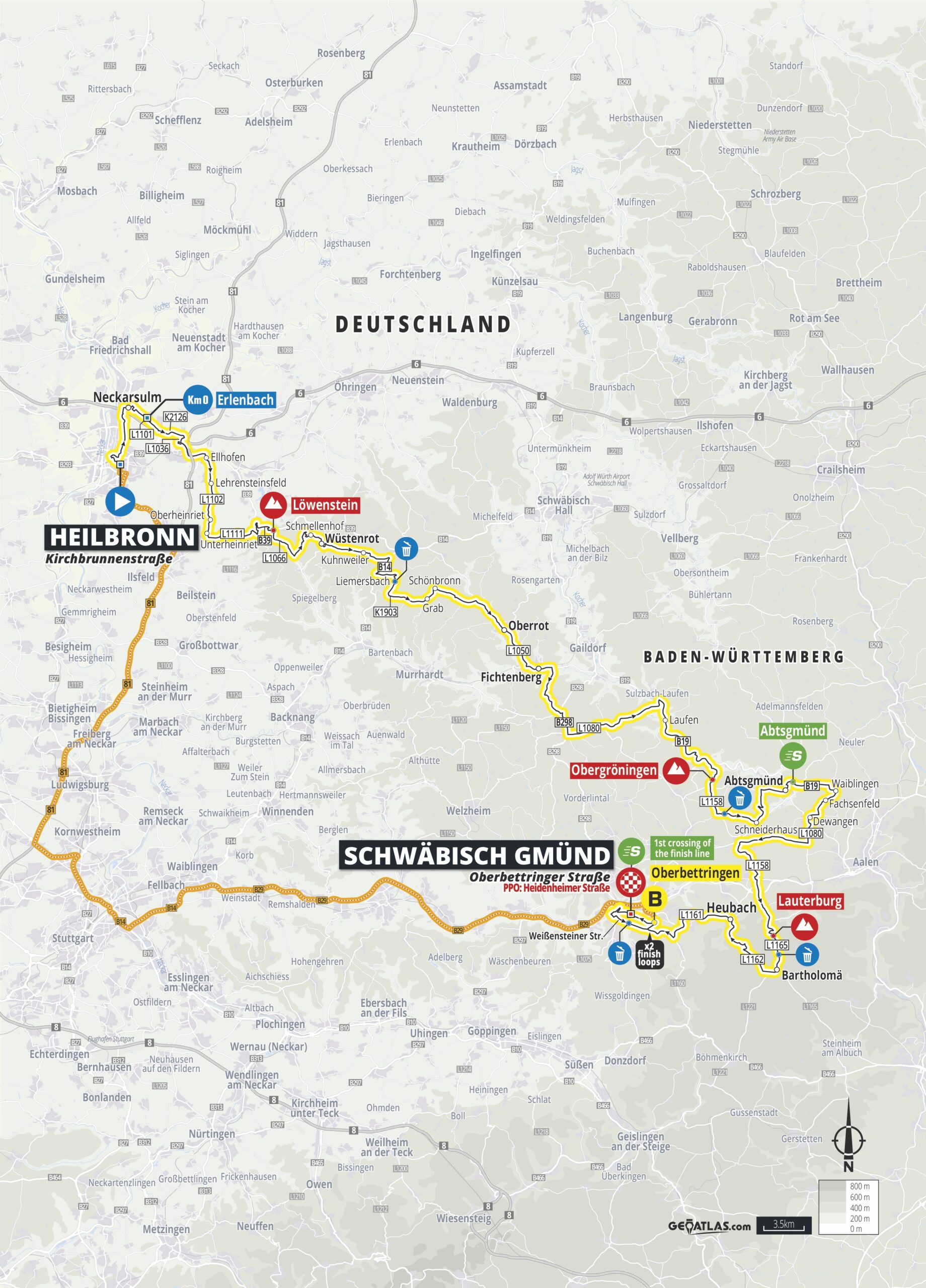 Kurz hinter Bartholomä kommt eine kleine Welle, ehe der Weg die Fahrer hinunter nach Heubach und deren Burgruine und weiter über Buch an die Rems nach Schwäbisch Gmünd führt. Nach der ersten Zielpassage absolvieren die Profis noch zwei Runden von jeweils 10 Kilometern Länge, deren Schwierigkeit im Anstieg hoch nach Oberbettringen liegt, wo es bei der letzten Überfahrt Bonussekunden zu gewinnen gibt. Schwäbisch Gmünd war schon 1980 – als die Deutschland-Rundfahrt durch den von Dietrich Thurau ausgelösten Radsport-Boom ihr Revival erlebte, Teil der Etappenfahrt.