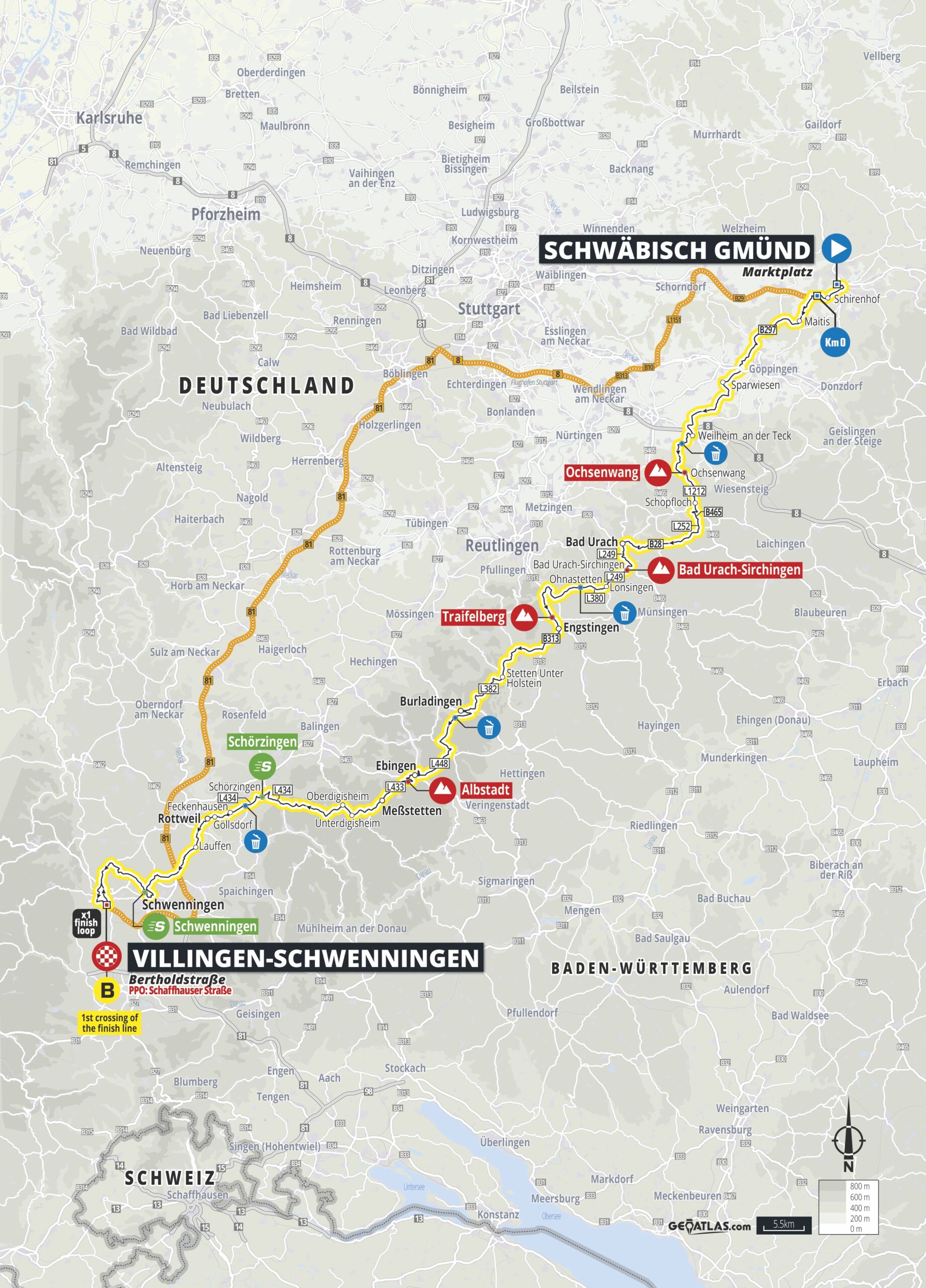 Highlight dieser fünftägigen Etappenfahrt ist zum einen der Klassikerabschnitt an Tag drei zwischen Heilbronn und Schwäbisch Gmünd. Zum anderen am nächsten Tag die Königsetappe über 212 Kilometer und knapp 3.000 Höhenmetern, die von Schwäbisch Gmünd über die Schwäbische Alb bis in den Schwarzwald nach Villingen-Schwenningen führt.