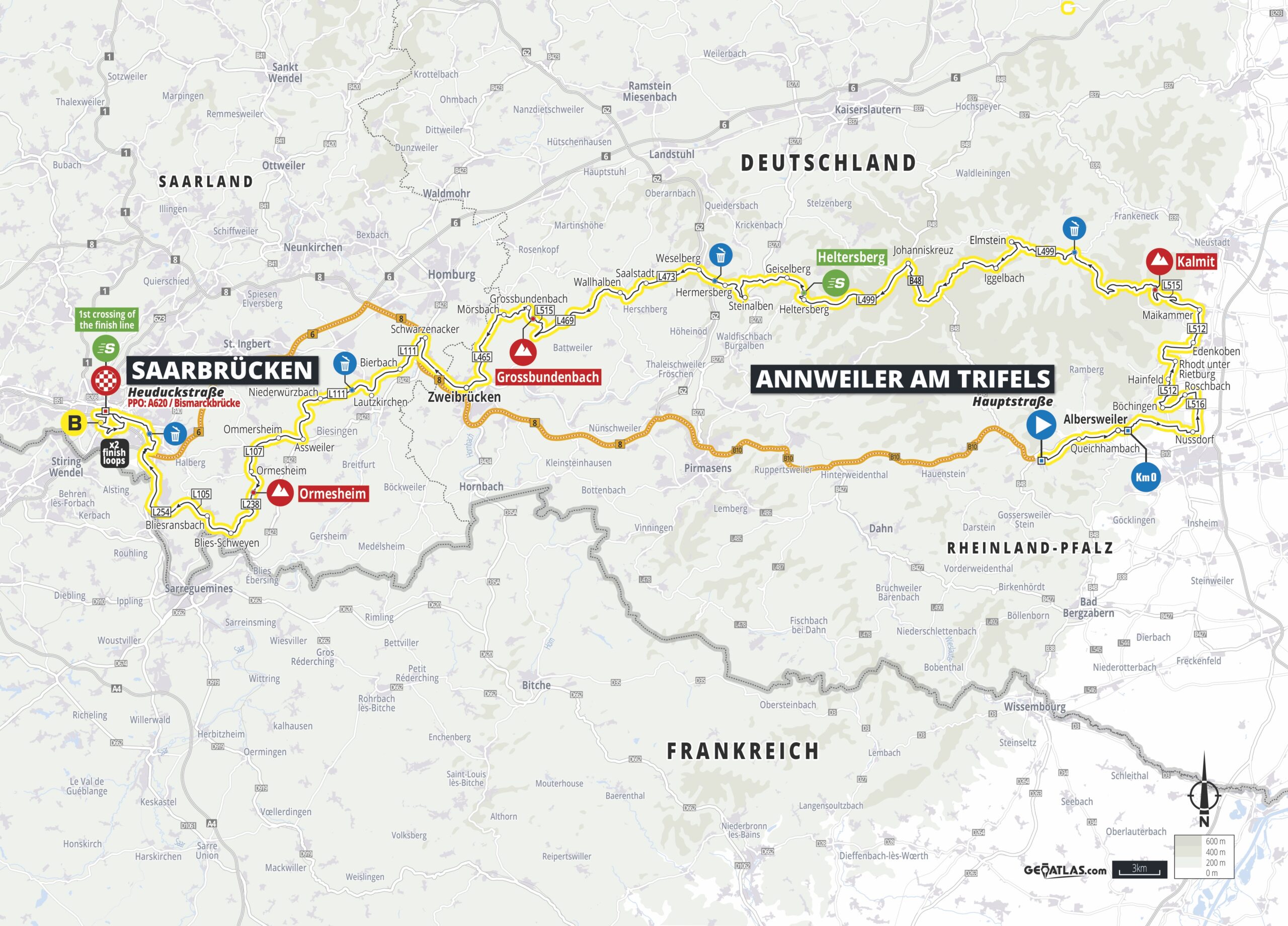 Hinter Zweibrücken überqueren sie die Landesgrenze und nähern sich entlang der Deutsch-Französischen Grenze der Landeshauptstadt Saarbrücken. Auf der Schlussrunde, die zwei Mal absolviert werden muss, gibt es einen kurzen steilen Anstieg in der Metzer Straße, der die Chance für eine späte Attacke eröffnet.