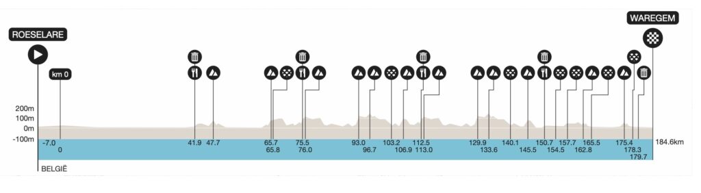 Nach dem Start in Roeselare geht es zunächst über weitgehend flach durch Westflandern. Ein Terrain, in dem sich klassischerweise die erste Fluchtgruppe des Tages formiert. Mit der Einfahrt in die flämischen Ardennen verändert sich das Bild. Dann folgen mit den die Hellingen und Kasseien die anspruchsvolleren Abschnitte des Rennens