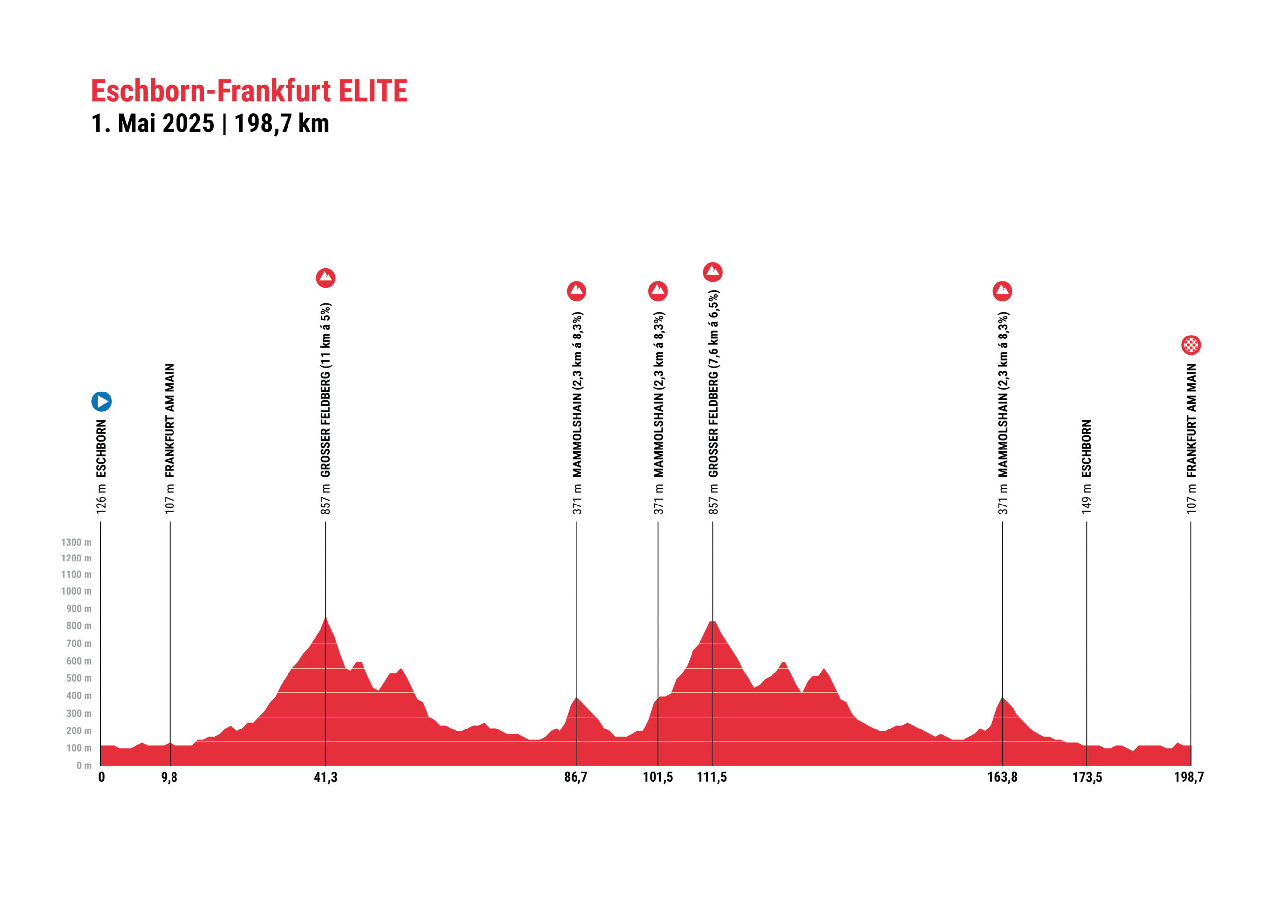 Zweimal müssen die Fahrer den Feldberg (857 Meter) überqueren – jedes Mal von einer anderen Seite – und dreimal den steilen Mammolshainer Anstieg bewältigen. Nach dem Start in Eschborn und der ersten Zielpassage in Frankfurt erreichen die Profis bereits in der ersten Rennstunde den ersten Anstieg zum Feldberg. Dieser führt über 11 Kilometer mit durchschnittlich 4,8 Prozent Steigung auf den höchsten Punkt des Taunus.
