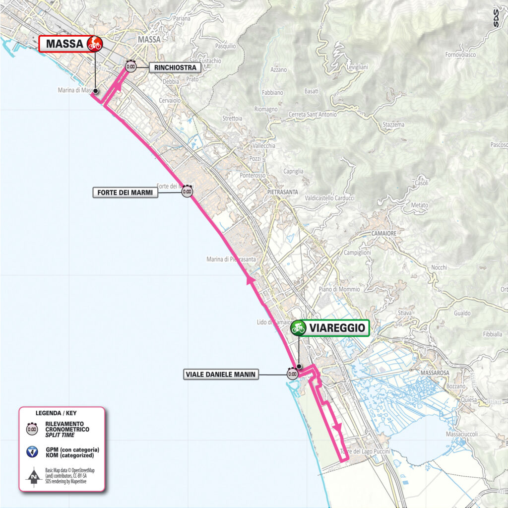Die einzigen Schwierigkeiten sind die Richtungswechsel auf den ersten zehn Kilometern rund um Viareggio und Torre del Lago Puccini. Nach der ersten Zwischenzeit folgt eine lange, gerade Passage an der Küste entlang, auf der je nach Windstärke und -richtung Geschwindigkeiten von über 60 km/h erzielt werden können.
