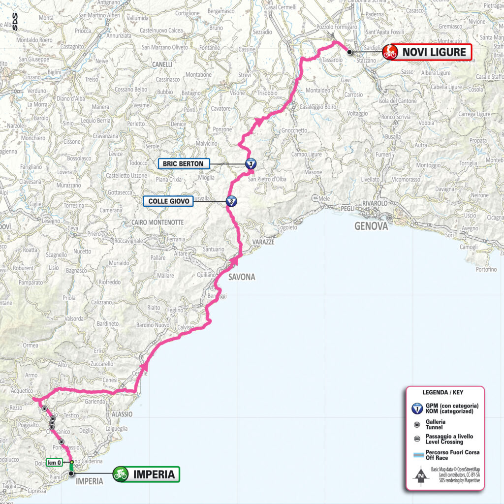 Die 12. Etappe beginnt, wie die elfte geendet hat. Mit einem Blick aufs Meer. Von Imperia am Ligurischen Meer aus führt der zwölfte Tagesabschnitt über 177 Kilometer nach Novi Ligure. Eigentlich eine Möglichkeit für die Sprinter, sofern sie sich an den zwei Anstiegen der 3. Kategorie – Colle Giovo und Bric Berton – schadlos halten. Von der letzten der beiden Bergwertungen aus sind es über 55 Kilometer bis ins Ziel, sodass dies durchaus möglich ist. Zudem ist die Anfahrt nach Novi Ligure schnell. Ein Überraschungsmoment könnte der Wind in der Po-Ebene sein, wenn er von der Seite bläst.