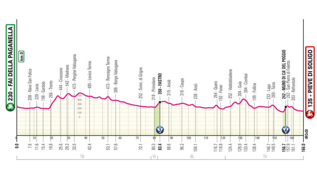 Zumal der Anstieg nach Civezzano hinter Trento schon zu einer Zäsur führen könnte und das ideale Sprungbrett für eine Fluchtgruppe darstellt. Im weiteren Verlauf führt der Parcours über welliges Terrain, das auf den finalen 40 Kilometern noch anspruchsvoller wird. Besonders die berühmte Muro di Ca‘ del Poggio (Kategorie 4) rund zehn Kilometer vor dem Ziel könnte die Entscheidung um den Etappensieg aus der Fluchtgruppe heraus bringen. Insgesamt acht Mal war die Mauer in den vergangenen knapp 20 Jahren Teil einer Giro-Etappe.
