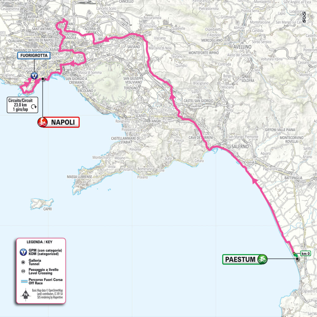 Von der antiken Stadt Paestum am Mittelmeer geht es in die Metropole Neapel. Die fünfte Etappe führt über 161 Kilometer durch Kampanien und scheint wie gemacht für Sprinter. Wäre da nicht ein Hügel, genauer gesagt ein knapp drei Kilometer langer Anstieg der Kategorie 4, der gut sieben Kilometer vor dem Ziel liegt. Es wird spannend zu sehen sein, wie die Sprinter-Teams ihren Kapitän auf dem finalen Stadtkurs so gut positionieren, dass er den Anstieg im Stadtteil Fuorigrotta vorne im Feld überfährt. Das Ziel liegt wie in den Vorjahren direkt am Meer, dem Golf von Neapel.