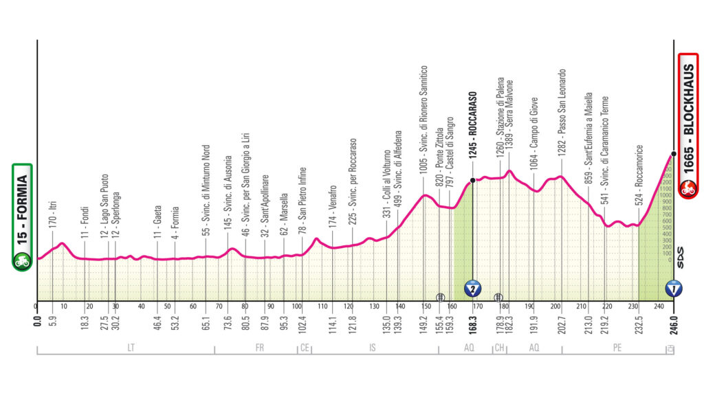 Dort wird nach 168,3 Kilometern eine Bergwertung der 2. Kategorie durchgeführt. Über den Passo San Leonardo erreichen die Fahrer nach einer Abfahrt Roccamorice. In dem Abruzzen-Dörfchen beginnt der 13,5 Kilometer lange Anstieg zum auf 1.665 Metern im Bergmassiv Majella gelegenen Blockhaus. Die letzten zehn Kilometer liegen konstant bei über zehn Prozent Steigung. Zuletzt war Jai Hindley 2022 als Erster hier oben.