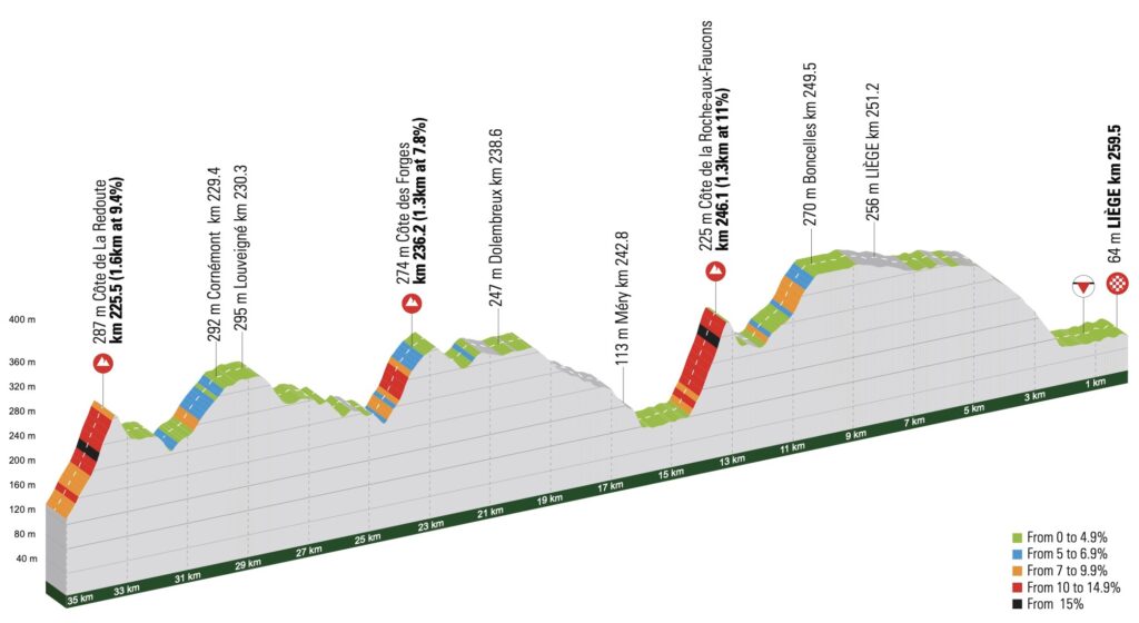 Auf die Côte des Forges folgt mit der Côte de la Roche-aux-Faucons der letzte große Prüfstein des Tages. Genau hier liegt eine besondere Gemeinheit dieses Finales: Die offizielle Bergwertung an der Roche-aux-Faucons über 1,3 Kilometer mit elf Prozent markiert noch längst nicht das wirkliche Ende des Anstiegs. Zunächst verläuft die Strecke flach, teils sogar leicht bergab, ehe sie bis Boncelles noch einmal für mehr als einen Kilometer anzieht. Erst danach beginnt die längere Abfahrt zurück nach Lüttich.