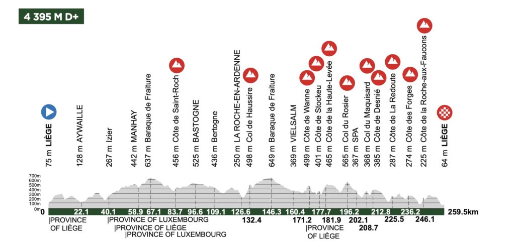 Wie auch im Vorjahr führt die Achterbahnfahrt durch die Ardennen weiter über den Col du Rosier und die durch den Motorsport bekannte Ortschaft Spa. 2026 haben die Streckenplaner allerdings mit dem Col du Maquisard noch einen weiteren Anstieg vor der Côte de Desnié eingebaut. Der Col du Maquisard ist zwar bei einer Länge von 2,4 Kilometern nur 5,7 Prozent steil, zieht nach über 200 Rennkilometern aber richtig Körner aus den Beinen.