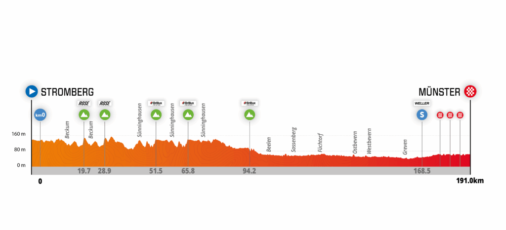 Mit der „Halbzeit“ ändert sich der Charakter. Hinter Beelen, Sassenberg und Füchtorf dominieren offene Landschaften – ein Terrain, in dem Seitenwind und Staffelfahren überproportionalen Einfluss gewinnen. Hinter Ostbevern erreicht das Feld dann den Kreis Steinfurt und die Stecke führt durch Greven. Richtung Sprakel wird die einzige Sprintwertung des Tages abgenommen. Von hier bis ins Ziel in Münster sind es nur noch 23,5 Kilometer. Das Finale ist im also schon in vollem Gange.