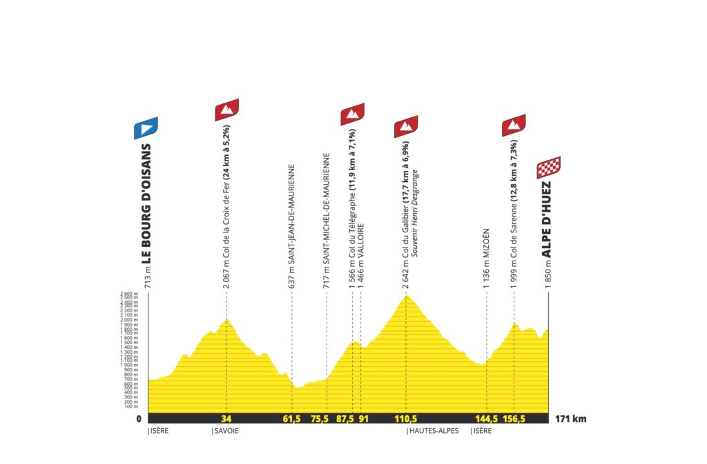 Am Tag danach beginnen die wilden Tage in den Alpen. Den Anfang macht nach 185 Kilometern die Bergankunft in Orcières-Merlette, die zuletzt 2020 Etappenziel einer Tour war. Die darauf anschließende mit 128 Kilometern kürzeste Straßenetappe dieser Tour lässt die Profis nach Alpe d’Huez klettern. Die drei Anstiege im Vorfeld der „Alpe“ dienen den Kletterern lediglich zum Aufwärmen, ehe es in die 21 Kehren nach nicht einmal drei Stunden Fahrzeit geht. Wer Revanche nehmen will, hat am Tag danach Gelegenheit dazu, denn die Alpe ist erneut Teil einer Etappe – und zwar der Königsetappe der Frankreichrundfahrt. Von Bourg d’Oisans aus führt die 20. Etappe über den Col de la Croix de Fer, den Col du Télégraphe und den Col du Galibier, der mit 2.642 Metern das Dach der diesjährigen Tour ist. Danach führt die Strecke unkonventionell über den Col de Sarenne hoch nach Alpe d’Huez.