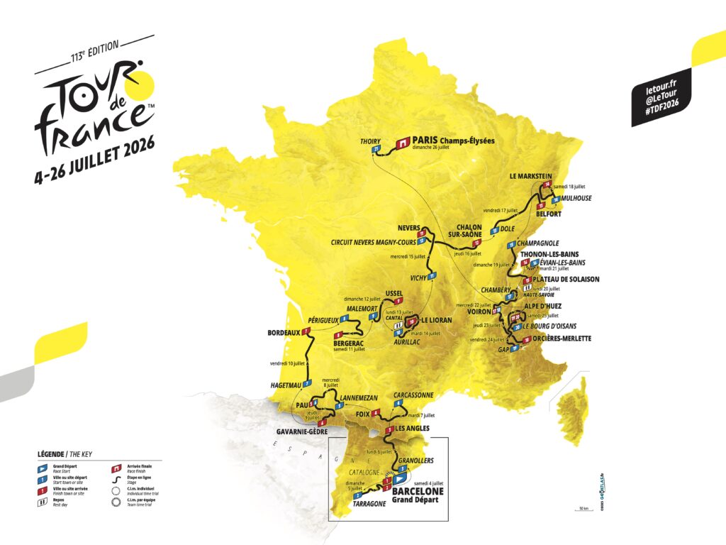 Die 113. Ausgabe der Tour de France führt vom 4. bis 26. Juli 2026 über 21 Etappen von Barcelona nach Paris. Insgesamt 3.333 Kilometer müssen die Fahrer verteilt auf sieben Flachetappen, vier hügeligen Etappen, acht Bergetappen mit fünf Bergankünften sowie je ein Einzel- und ein Mannschaftszeitfahren in den mehr als drei Woche zurücklegen. Sie durchqueren mit den Pyrenäen, dem Zemtralmassiv, den Vogesen, dem Jura und den Alpen insgesamt fünf Gebirgszüge. Am Ende summieren sich die erklommenen Höhenmeter auf insgesamt 54.450.