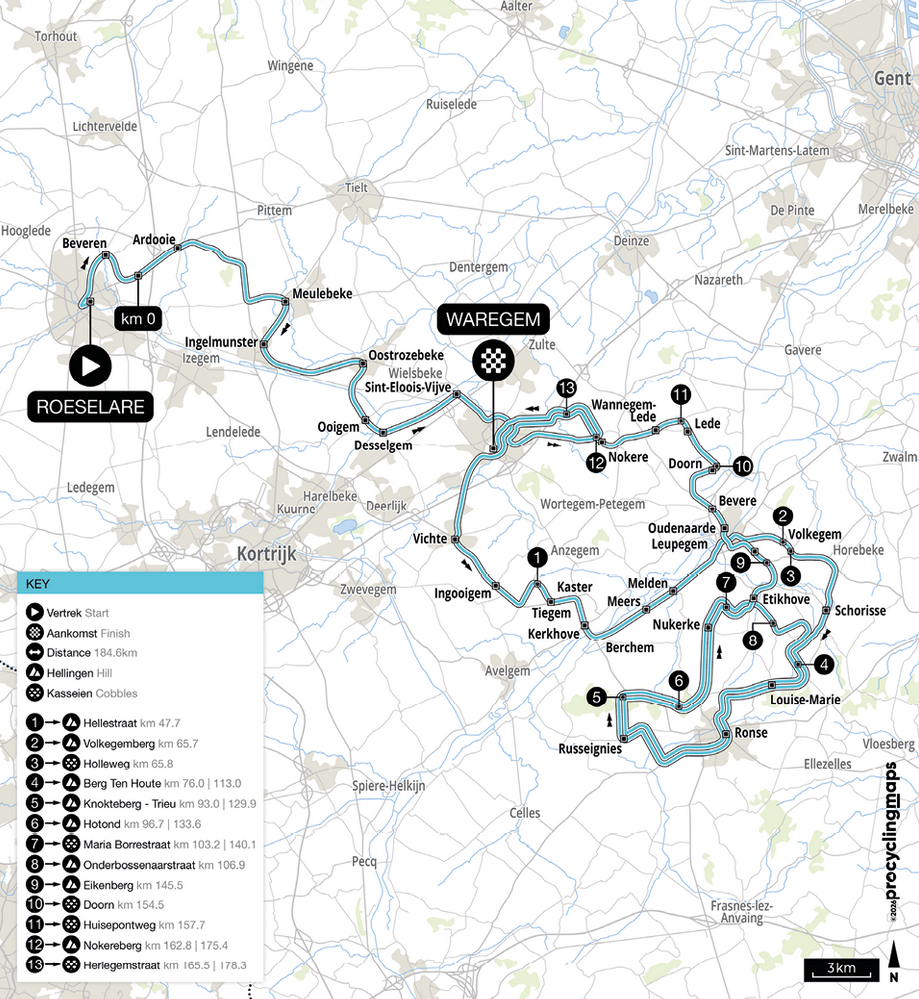 Mit der Onderbossenaarstraat wurde ein weiterer neuer Helling in die Strecke aufgenommen. Der Anstieg liegt in der zweiten Rennhälfte bei Rennkilometer 106,9 und verschärft jene Phase, in der ohnehin kaum Zeit zum Durchatmen bleibt. Anschließend führt der Parcours über den Eikenberg sowie die bekannten Kasseien Doorn und Huisepontweg. Auf den finalen 40 Kilometern müssen die Fahrer über den Eikenberg, zwei Mal den Nokereberg überqueren und und kurzu vor Ziel über Herlegemstraat „brettern“.